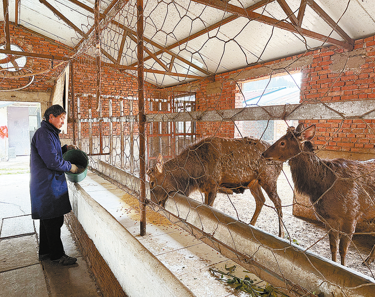3月20日,工人在华兴养殖合作社内给鹿喂饲料。该合作社位于丹凤县棣花镇棣花社区,合作社积极探索特色养殖新模式,发展产业带动附近村民共同致富。