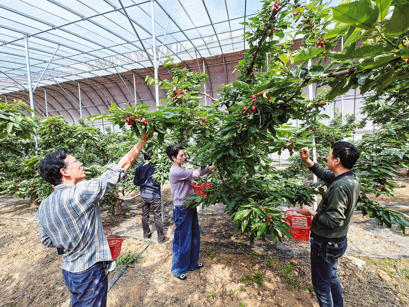 柞水县下梁镇石瓮子社区因地制宜发展水果采摘园308亩,带动当地产业发展,促进群众增收。图为3月27日,游客来到果园采摘车厘子,既享受了亲自采摘的乐趣,又为果园带来了收益。 (本报通讯员 姜 勇 摄)