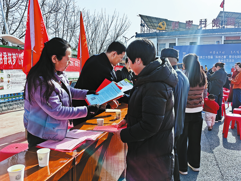 近日,山阳县启动第三十四届“科技之春”宣传月暨文化科技卫生“三下乡”集中示范活动。图为志愿者在十里铺街道郭家村咨询点向群众发放资料,普及法律、健康等方面的知识,为群众提供义诊服务和健康咨询。(本报记者 杨若阳 摄)