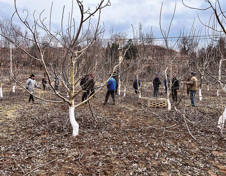 在景村镇八一村红仁核桃示范基地,务工群众对核桃树进行剪枝管护。本报记者 南 玺 刘佳乐