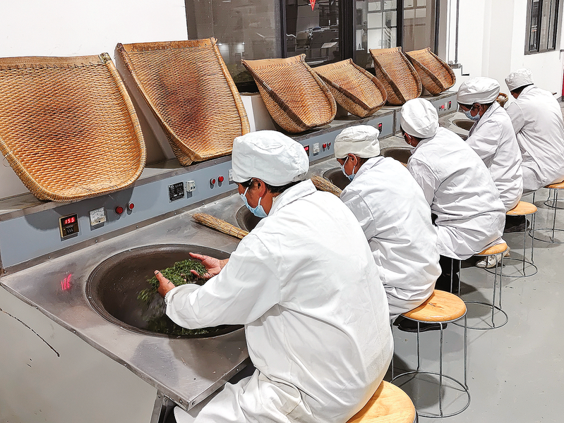 近期,商南县富水镇油坊岭村的万亩茶园陆续进入采摘期,漫山遍野的茶树吐露新芽,务工人员穿梭其间忙碌采收,茶企也开足马力加工“明前茶”。图为3月28日,工人在加工车间炒制茶叶。