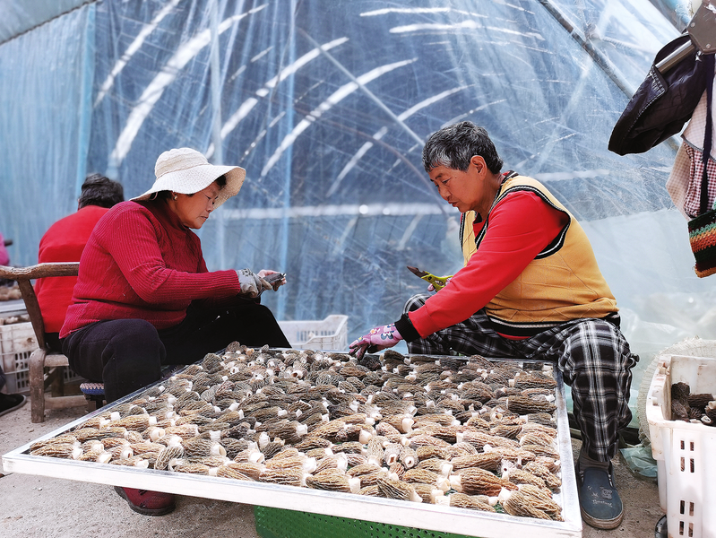 4月1日,在丹凤县武关镇梅庄村羊肚菌种植基地,工人正在处理刚采摘的羊肚菌。据悉,该村通过“村企联建”模式,依托丹凤茗韵农业科技有限公司,建成羊肚菌生产基地30亩,带动周边50多户村民稳定就业,户均年增收1万元。 (本报通讯员 杨 晓 摄)