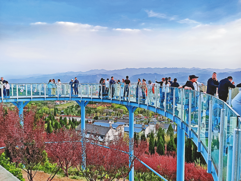 清明假期,我市精心推出系列特色活动,吸引众多游客前来踏青赏玩。图为4月5日,游客在商州区金凤山生态公园玻璃栈道观景台观赏风景、打卡拍照。 (本报通讯员 彭 涛 摄)