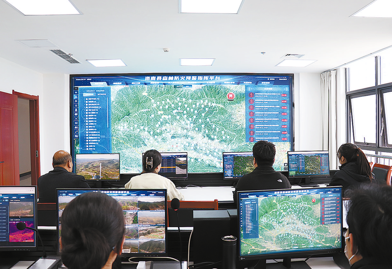 洛南县森林防火预警指挥平台指挥大厅内,工作人员实时 关注全县森林防火情况。全县共有163个视频监控、16架巡航无人机、200个宣传播报点以及1个县级总平台和3个分平台,构建起了洛南县全域一体化智慧防控体系。