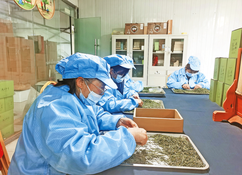 产业发展成效如何,最终还要看能不能让群众稳定增收。在瑞君生态茶园基地,2000多亩茶园沿山势绵延展开,到了采茶时节,山上山下满是忙碌身影。50多岁的村民汪荣丽,如今就在这里务工。采摘季,她上山采茶;平日里,她在车间分拣鲜叶,一天收入100多元。“我年龄大了,外出打工也不方便。现在在家门口的茶厂干活,收入稳当,还能顾得上家里老小。”她的话朴实真诚,道出了不少群众的心声。像她这样依托茶园、茶厂实现家门口就业的群众,仅在瑞君茶园就有50多人,一片片小叶子撑起了群众实实在在的“钱袋子”。