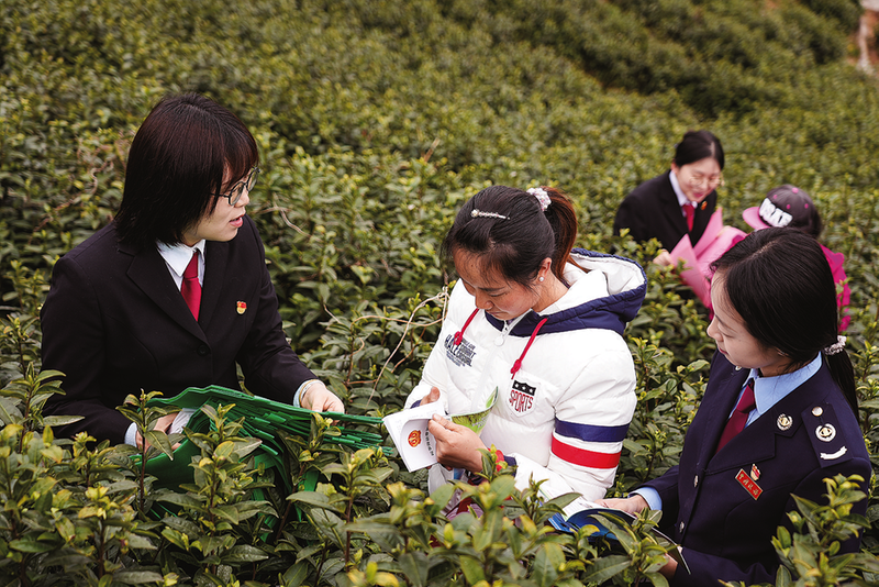 2026年3月26日,商南县人民法院富水法庭党支部携手县税务局富水分局党支部,开展“法税联动·共护茶乡”茶文化主题党日活动,图为法官向茶农讲解法律知识。本报通讯员 任丹江 张 萍